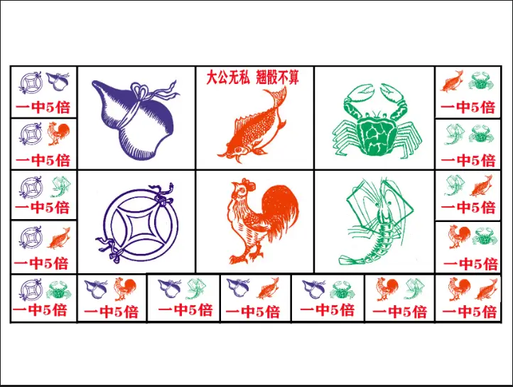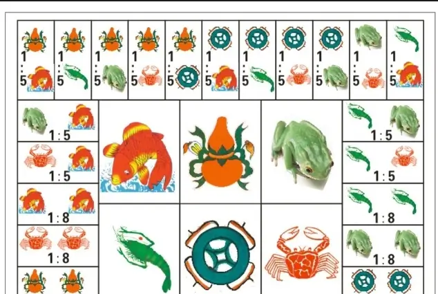 押两种图案,例如“鱼+蟹”“虾+金钱”。